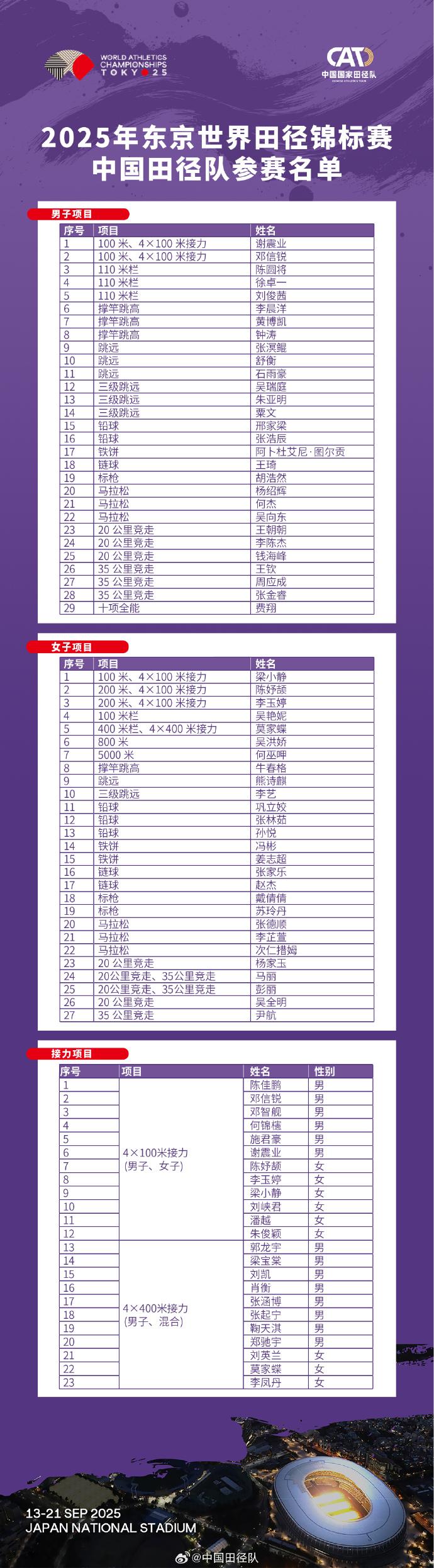 中国田径队将派出73名运动员(男运动员41人、女运动员32人),参与33个小项的比拼。具体名单如下↓